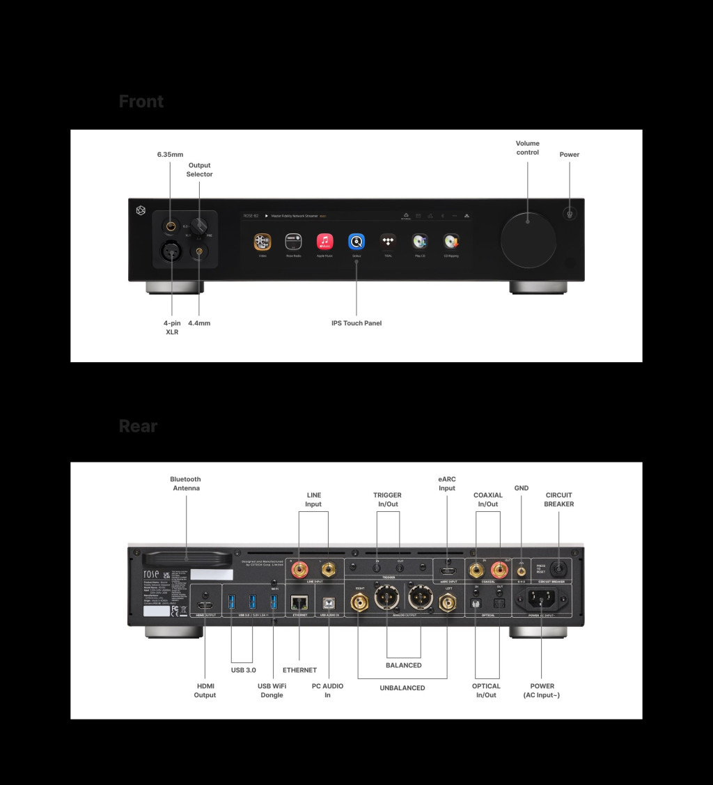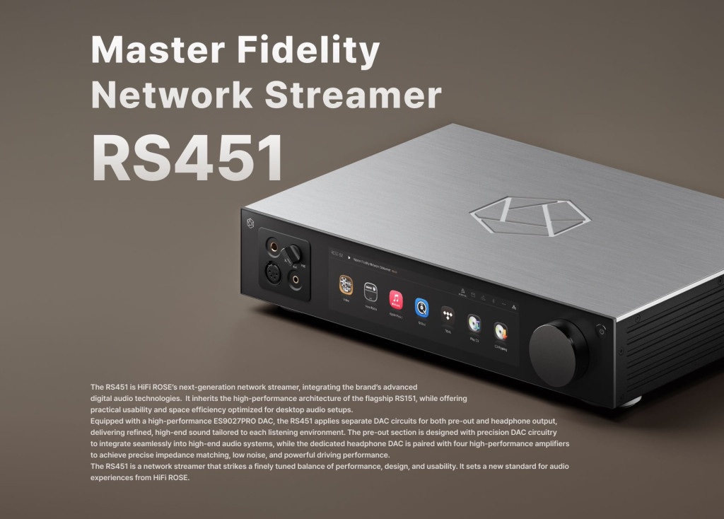 Az RS451 streamer praktikus funkciókat kínál kompakt méretben kiemelkedő hangminőséggel. Az RS151 fejlett digitális architektúráját ötvözi a rugalmas használat módokkal. High-End rendszer forrásaként, a nappali szórakoztató központjaként, és akár a munka asztalon is alkalmazható. 8,8 inches LCD érintő kijelzője 1920×480-as felbontást kínál 237×67 mm méretben. Innen is vezérelhető, és a tartozék távvezérlővel a mindennapokban, illetve a Rose alkalmazással pedig kényelmesen böngészhet a zenei szerverek kínálatában. A hátlap analóg kimenetét független ES9027 PRO chipset szolgálja ki. A fejhallgató kimeneteken oldalanként külön erősítő dolgozik, másik ES9027 PRO dekóderrel. Igen két különálló DAC egységet tartalmaz a hálózati lejátszó!